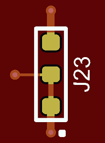 The jumpers and headers have a J reference designator. Several of the jumpers have been replaced by a special trace-link PCB structure, in which the default value for the jumper is hardwired into the design. A representative picture of this PCB structure for jumper J23 is shown in the figure below, labeled “Trace-Link Jumper”. To change the value of these jumpers, the user must cut the default trace and install a resistor across the alternate connection pads. For instance, to change the configuration of J23, cut the trace between pins 1 and 2, and install a zero Ohm 0603 surface-mount resistor between pads 2 and 3. In some cases, jumpers have been replaced with a single 0 Ohm resistor. For these jumpers, the options are either installed (IN) or not installed (OUT). The resistors used in these locations are listed in Table 4-1. In other cases, a standard jumper cap must be placed across jumper pins in the default position for default operation of the device.
