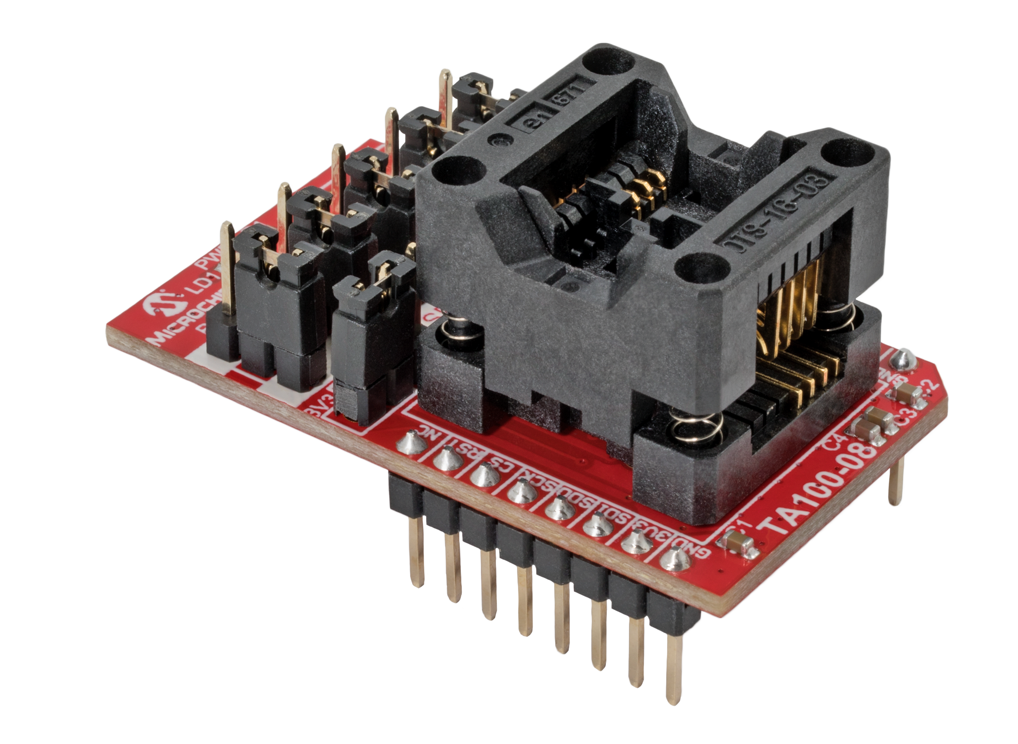 The TA100 secure elements are one-time-programmable devices. Having a socket board allows for a customer to reuse the board with multiple TA100 sample devices for a given application or for multiple different applications. The 8-Pin SOIC socket board is capable of being used with both the I2C and SPI interface versions of the TA100 device.