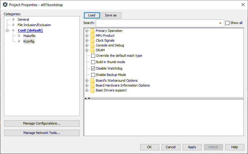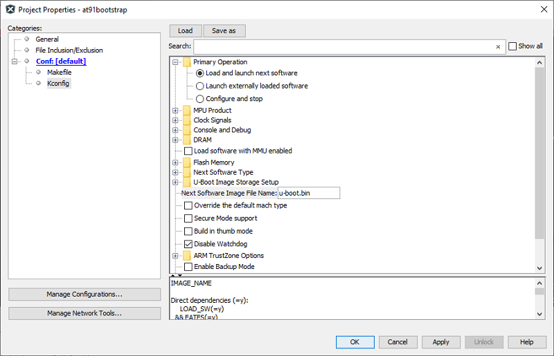 - Load {evaluation_kit}_bkpt_none_defconfig. For example, on SAMA5D2 Xplained Evaluation Kit, select sama5d2_xplained_bkptnone_defconfig as the configuration file