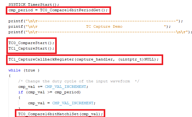 The above code shows how to use the TC module in capture mode to measure the duty cycle and frequency of an external input. The TC channel is set to capture mode to measure the duty cycle and frequency of the PWM signal. This PWM signal is produced by another TC channel configured in compare mode. The output from the compare TC channel is connected to the input of the capture TC channel.