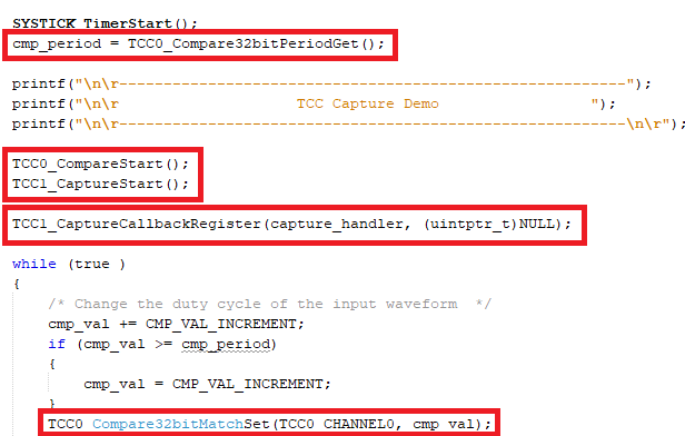 The above code shows how to use the TCC module in capture mode to measure the duty cycle and frequency of an external input. The TCC channel is set to capture mode to measure the duty cycle and frequency of the PWM signal. This PWM signal is produced by another TCC channel configured in compare mode. The output from the compare TCC channel is connected to the input of the capture TCC channel.