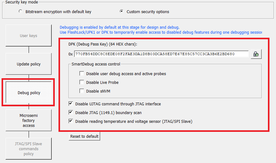 (Ask a Question)The debug pass key (DPK) is a debug passcode that overrides all debug-related locks. DPK may be unlocked using the plaintext or the one-time-use passcode protocol. It stays in effect only until the device is reset or power cycled.