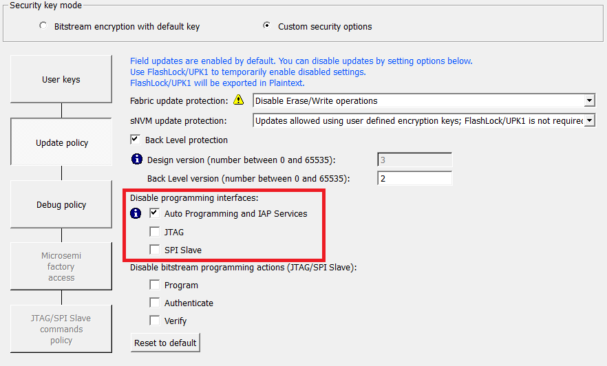 | Disable Auto Programming and IAP Services | This lock disables Auto Programming, Auto Update, IAP Services, and Programming Recovery. SPI initialization functionality is not affected. FlashLock/UPK1 unlocking is only available for JTAG and SPI Slave interfaces. |