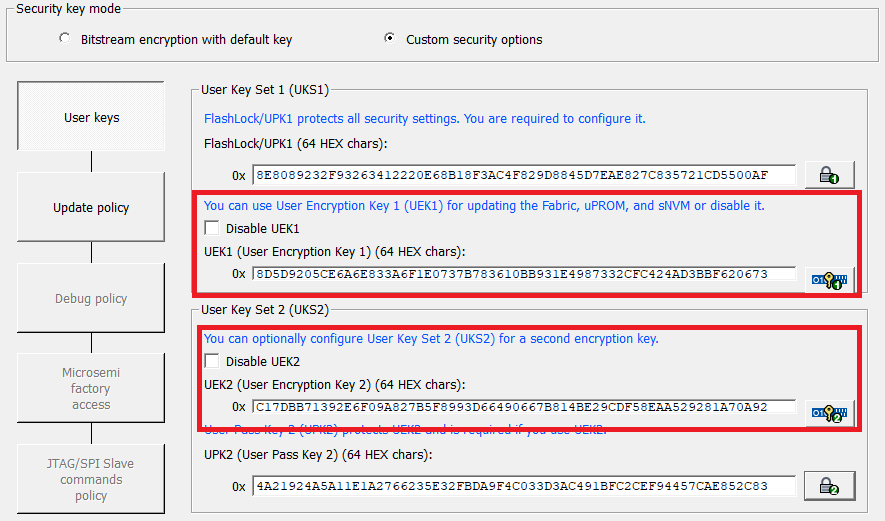 (Ask a Question)The user encryption key1 (UEK1) and user encryption key2 (UEK2) are user-defined 256-bit symmetric keys. These keys are wrapped by the PUF as key codes and then stored in the pNVM. Either of these keys can be used as the root key for encrypting and decrypting bitstreams, and to authenticate them.