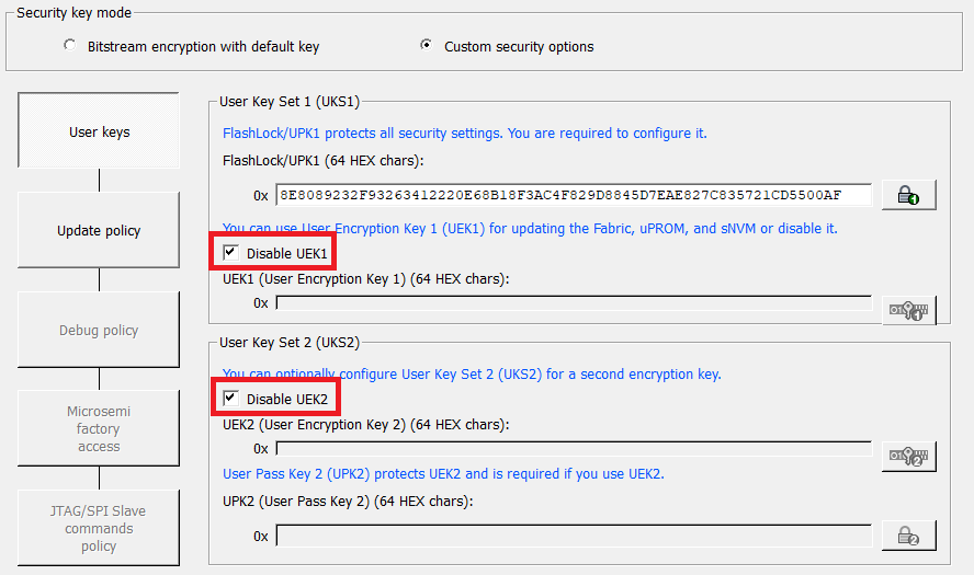 In the Configure Security Wizard, click User keys and select Disable UEK1 and Disable UEK2 to disable UEK1 and/or UEK2 key mode, as shown in the following figure.