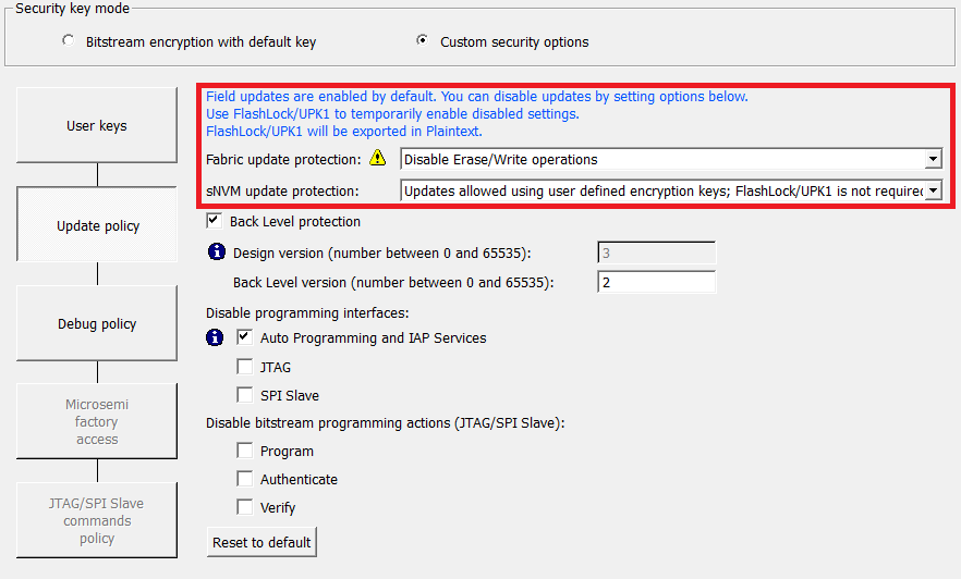 In the Configure Security Wizard, the Update Policy is used to apply the FPGA fabric and the sNVM update protection lock bits.