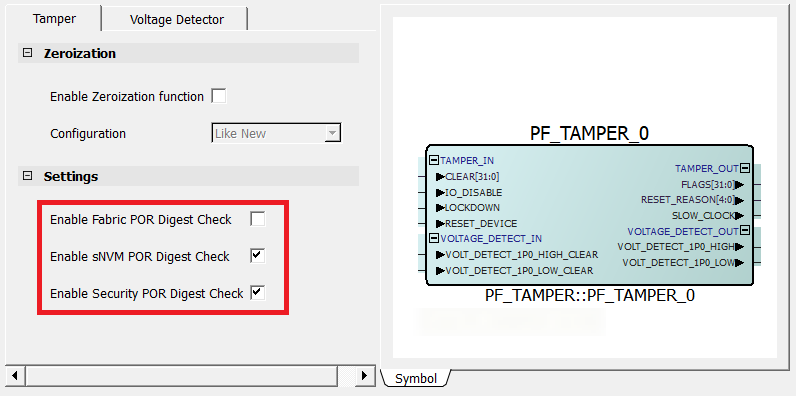 (Ask a Question)The device may be configured to perform automatic component digest checks while powering up the user design (after power-on reset) to check the integrity of the selected components. The user can specify which digest to check. If any of the selected digest checks fails, a tamper event is generated to fabric for user action. A digest check failure is an indication that the programmed content currently in the device is not what was last programmed into the device and cannot be trusted and that the device must be reprogrammed. The power-on digest check can be enabled and monitored using PF_TAMPER macro for PolarFire FPGA and PFSoC_TAMPER for PolarFire SoC FPGA.