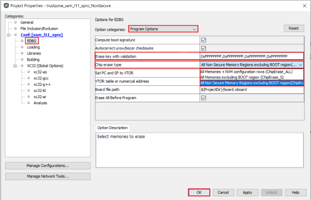 Click OK. Figure 2-13. Non-Secure Project EDBG Program Options Properties