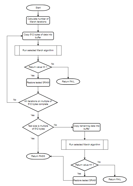 Self-test for the SRAM element looks for stuck-at faults, DC faults and addressing faults with the help of RAM March algorithms. One of the input arguments to this self-test selects the algorithm. This self-test copies the data from the tested area of the SRAM into the reserved area in the SRAM and restore the data after the test. The tested SRAM should be within the range defined in kseg1 (non-cacheable memory, refer datasheet) area of the device. Refer to section Configuring the Library for the details on reserving the SRAM. The stack pointer is moved to the reserved area in the SRAM before running this self-test. The SRAM self-test can be used at startup as well as run-time.