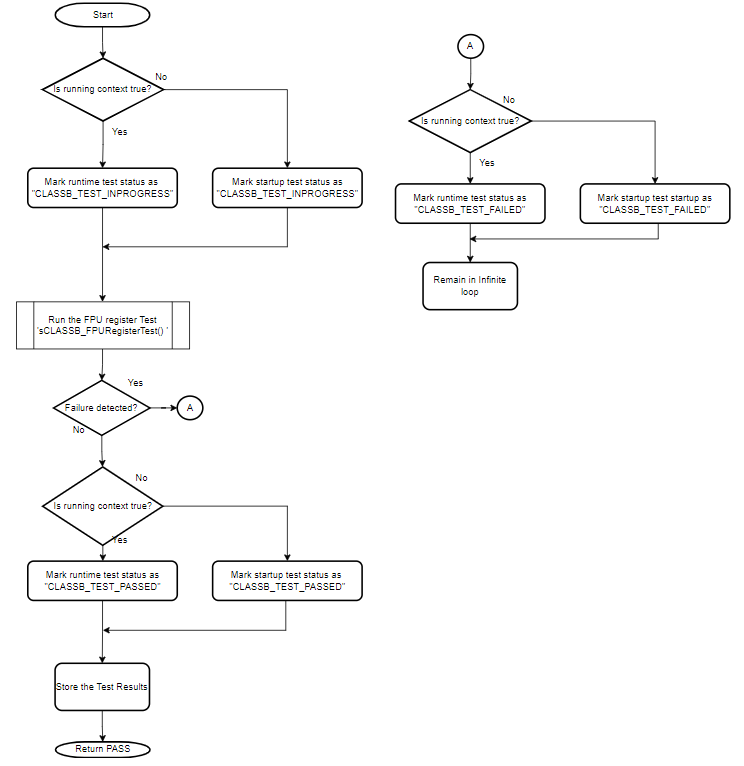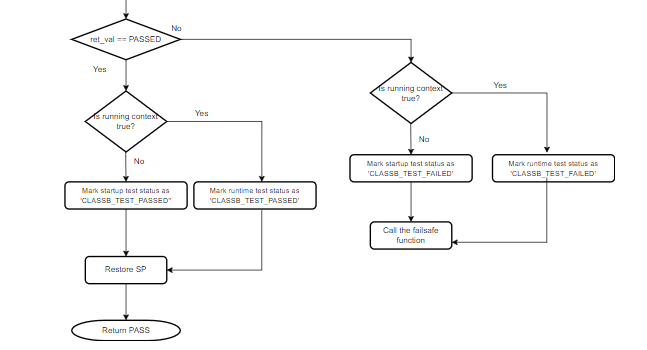 If the self-test for CPU registers, FPU registers, PC or Flash detects a failure, the code execution is stopped, and it remains in an infinite loop. This is to prevent unsafe code execution. In the case of non-critical components, a failsafe function (CLASSB_SelfTest_FailSafe) is called when a failure is detected. This function contains a software break point and an infinite loop. Further code shall be added into this function as per the application need. The failsafe function must not return to the Class B library, since it is called due to a self-test failure. Avoid use of features which depend on the failed component. For example, if self-test for clock is failed, it is not advisable to use UART for error reporting as BAUD rate may not be accurate. In the case of SRAM failure, avoid the use of function calls or use of variables in SRAM. A simple error reporting mechanism in this case of SRAM failure can be toggling of an IO pin.