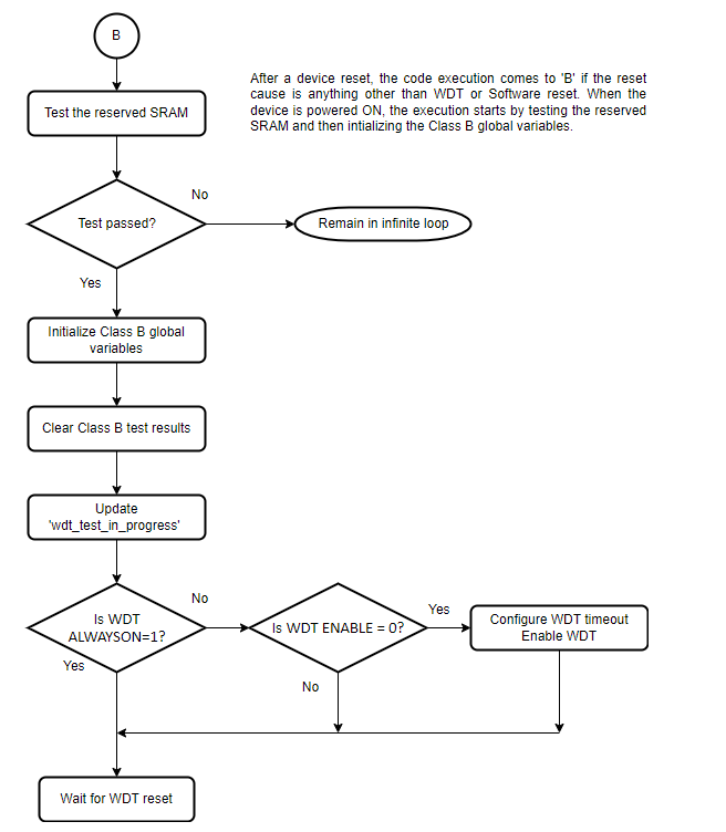 The Watchdog timer is used as a recovery mechanism in case of software failures. The Class B library enables the WDT and checks whether a WDT reset is issued if the timer is not cleared. User must ensure to configure proper time out period of WDT using MCC as per the application needs to avoid long startup.