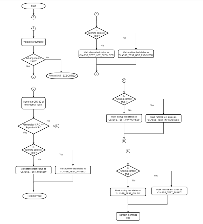 This self-test uses a CRC-32 generation function. This function is used inside the Class B library to generate CRC-32 of the internal Flash memory but it can be used on any contiguous memory area. The flash self-test can be used at startup as well as run-time. If this self-test is used during start up, it must be ensured that the CRC of the application area is precalculated and stored at a specific memory address which is passed as an argument for the Flash self-test. If this self-test detects a failure, it remains in an infinite loop.
