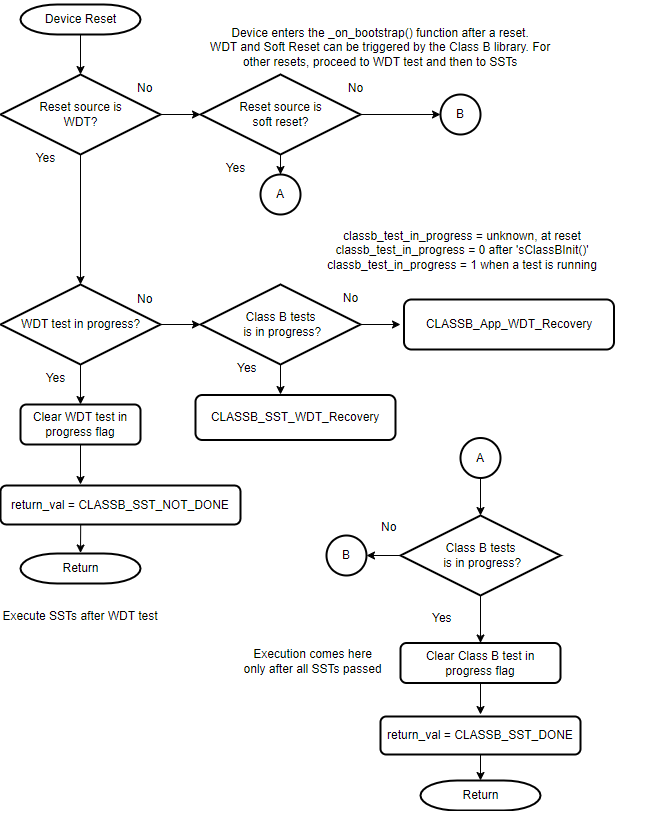 The Class B library contains many self-test routines those can be executed at startup and run-time. If a self-test is executed at startup, it is called as a Start-up Self-test (SST) and if it is executed at run-time, then it is called a Run-time Self-test (RST). There are a few self-tests which can be used only as SST or as RST, such self-tests have SST or RST in the API name eg: CLASSB_RST_IOTest(), CLASSB_SST_InterruptTest(). If a self-test API does not have SST or RST in its name, then it can be used at startup as well as runtime.