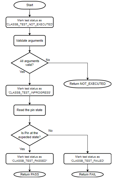 As the exact use of an IO pin is decide by the application, it is the responsibility of the application to configure the IO pin direction and drive the pin to the expected state before calling this self-test. When testing an input pin, ensure that the IO pin is externally kept at a defined logic state. The IO pin self-test can be used only at run-time.