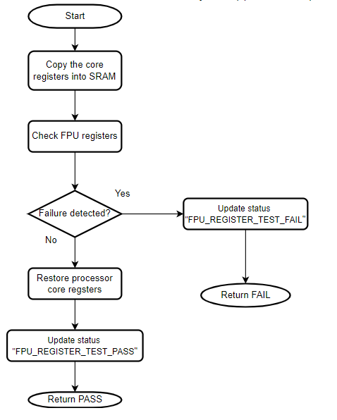 The self-test for FPU checks whether a stuck-at condition is present in the FPU register. The stuck-at condition causes register bit to remain at logic 0 or logic 1. Code execution should be stopped if this error condition is detected.