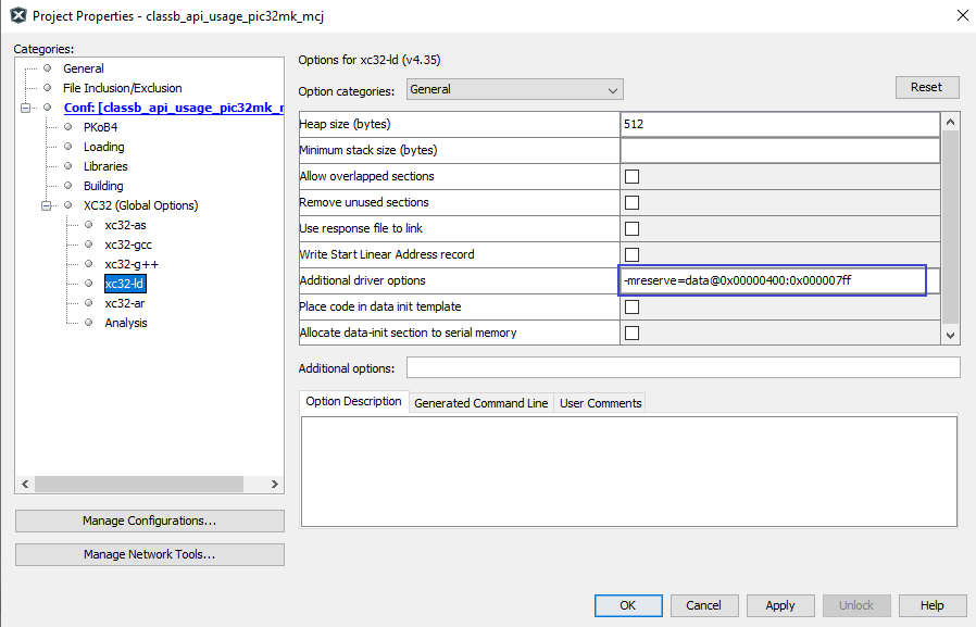 It is required to reserve 1kB of SRAM for exclusive use by the Class B library. This reserved SRAM must not be accessed from outside the Class B library. To check or update test results, use the corresponding interface APIs. When the Class B library is added into the project with the help of MCC, the linker setting is modified by MCC as shown below.