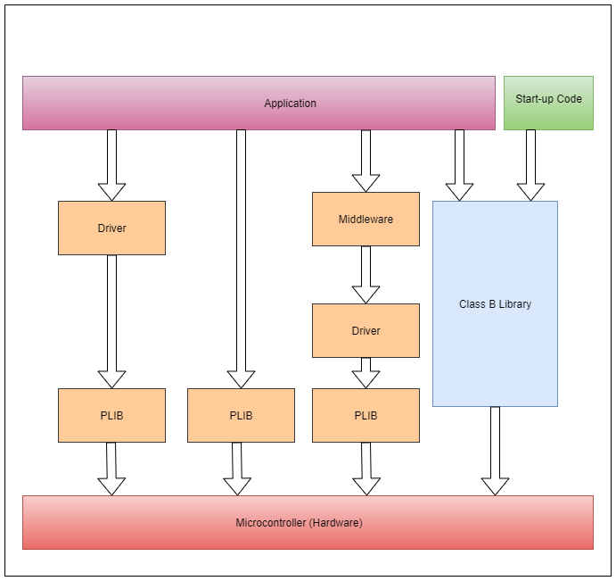 This topic describes the basic architecture of the Class B library and provides information and examples on how to use it. APIs defined by the Class B library can be used either by the start-up code or by the application code. The application may use PLIBs, drivers or middleware from the Harmony 3 software framework along with the Class B library code.