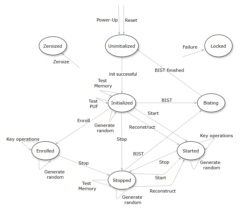 In the Initialized state, several operations can be performed: BIST, Test PUF, Test SRAM, Generate Random, Enroll, Start, Reconstruct, and Stop.