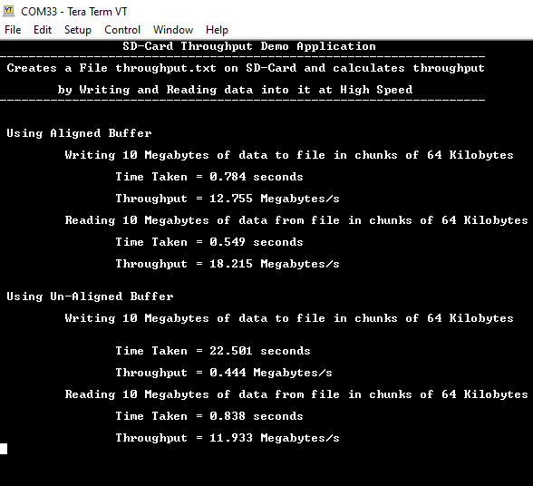 Application performs below filesystem operations and throughput calculations on SD-Card using both Aligned and Unaligned buffers
