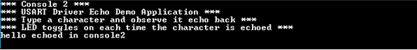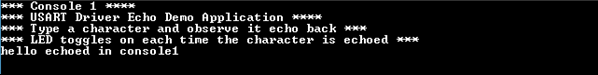 This example echoes the received characters over the two consoles using the USART driver in asynchronous mode.
