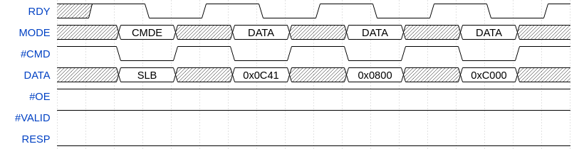 All set/clear/get operations start by a CMDE command with the relevant op code, followed by one or more DATA commands carrying data. The first data carries bits [15:0], the second data carries bits [31:16], the third data carries bits [47:32], etc.