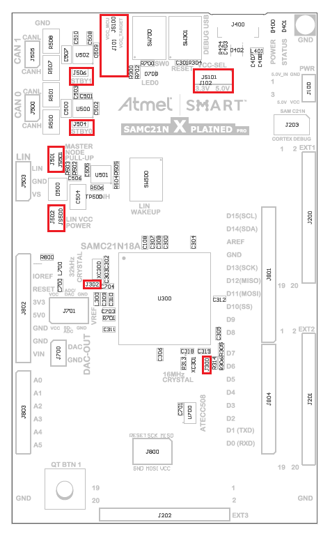 J102 | VCC_P5V0 (pin 1) and VCC_P3V3 (pin 3) | VCC_TARGET_SWITCH_P3V3_P5V0 | Use this jumper (JS101) to select either 5.0V or 3.3V