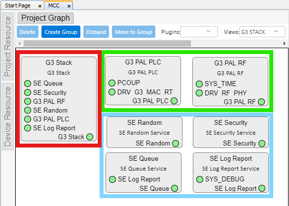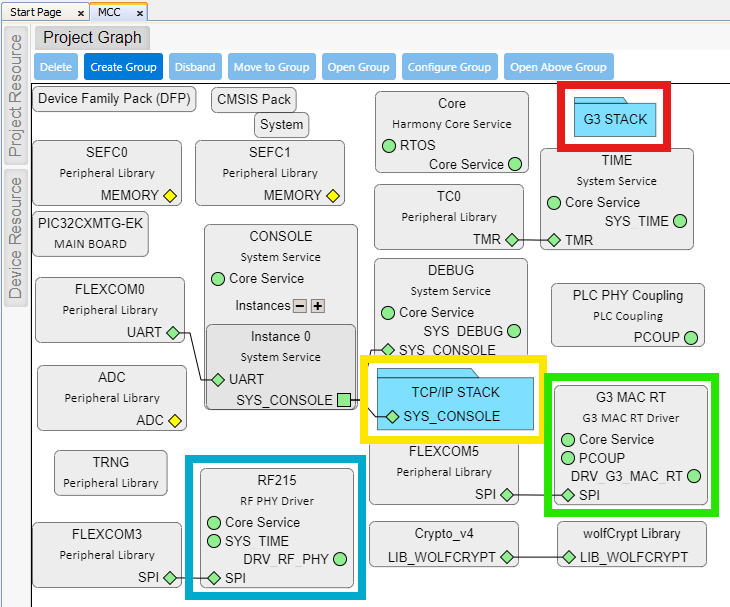 The following figure shows the MCC Project Graph of a G3 Device application, where the different modules are Highlighted: