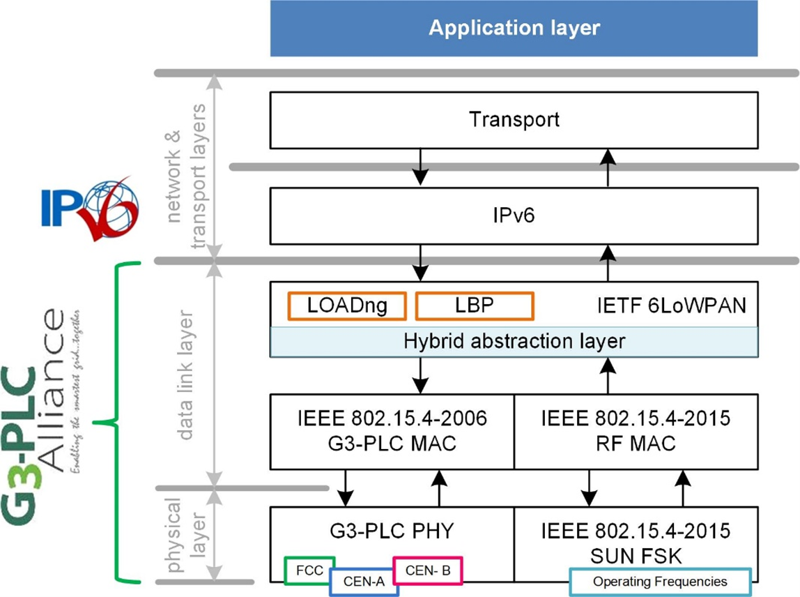 The data link layer comprises a Hybrid Abstraction layer which has the main function to redirect the data flow to/from the appropriate interface (PLC and RF MAC service primitives, adaptation layer service primitives) while keeping the 6LoWPAN Adaptation layer mechanisms unchanged (same frame format, same IPv6 compression rules, use of the LowPAN Bootstrap Protocol, use of the mesh-under LOADng routing protocol). The only exception lies in the definition of a new link cost formula that takes into account the characteristics of RF links (link quality, duty cycles) intended for route cost computation during LOADng route discoveries.