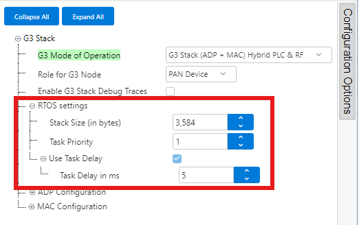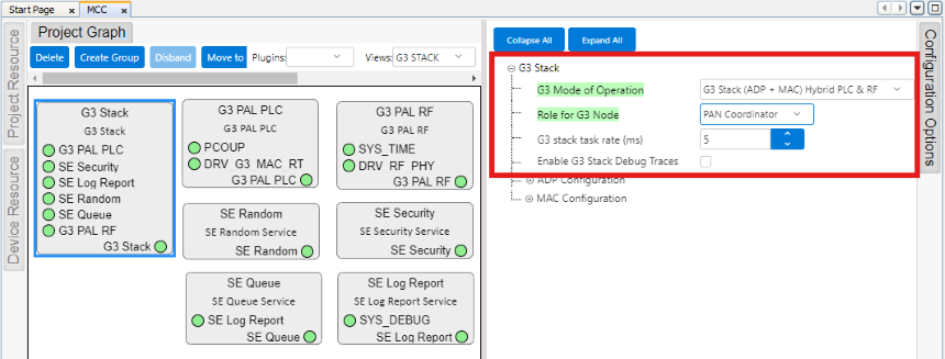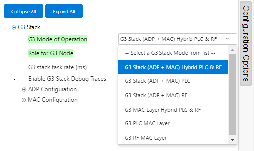 The first configuration option, which will determine the availability of the rest, is to decide whether the user will use G3 stack at ADP level (full G3 stack) or at MAC level (only IEEE-802.15.4 MAC layer functionality), and in any of those access levels, whether the user wants to have PLC MAC, RF MAC, or both MAC layers (Hybrid mode) available.