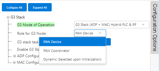 This option is only available when Mode of Operation is one of those using the full G3 Stack (Roles do not make sense at MAC level). Different Roles are: