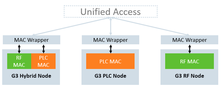 The G3 MAC Wrapper module is located below the G3 Adaptation layer and on top of both PLC and RF MAC layers. Its mission is to provide abstraction to upper layer (being G3 Adaptation layer or an application running on top of G3 MAC), to the fact that the user is working on a PLC node, an RF node, or a Hybrid (PLC and RF) node.