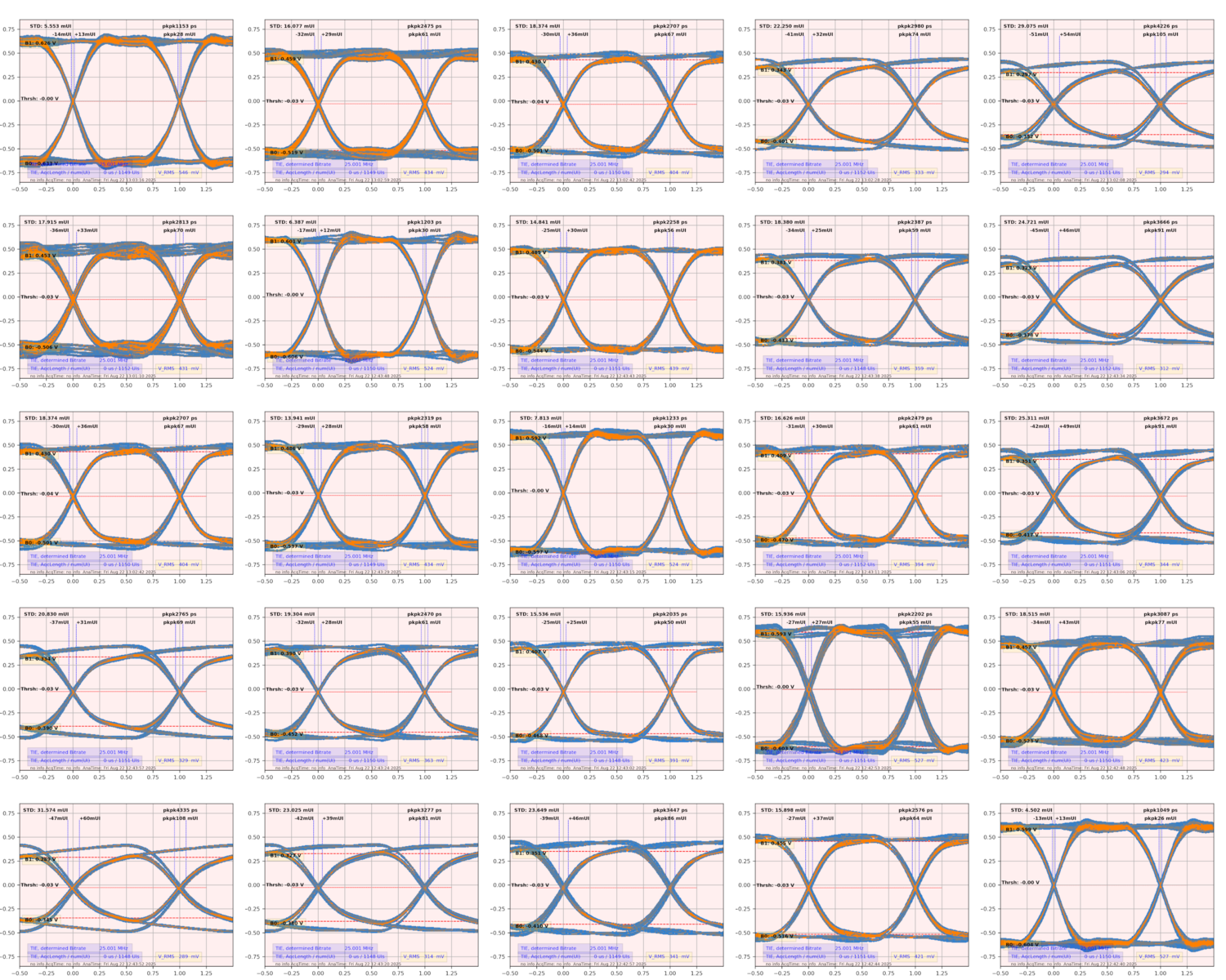 It is clearly visible that the worst case scenario for this mixing segment is when Node 0 transmits and Node 4 receives, or vice-versa. In either case, a jitter of about 2 ns exists on timing of signals with a maximum eye-opening of about 415 mV and a signal noise of about 1.5 mV.