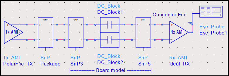 IBIS-AMI simulation was performed on one of the traces going from the PolarFire FPGA TX to the SFP male connector. And, the eye diagram was captured at the connector. The simulation topology is shown in the following figure.