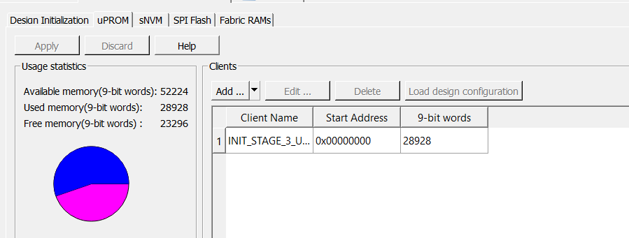 MiV_SS_0/MIV_RV32_C0_0/MIV_RV32_C0_0/u_ipcore_0/gen_tcm0.u_subsys_TCM_0/tcm_ram_macro.u_ram_0instance is generated and stored in µPROM. This step must be verified by viewing the third stage client created in the µPROM tab, as shown in the following figure.Figure 2-8. Third Stage INIT Client