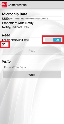 After Enabling the Notify/Indicate Toggle Button Mobile App can read the data 31(Hex Value) which was sent from RNBD Module.