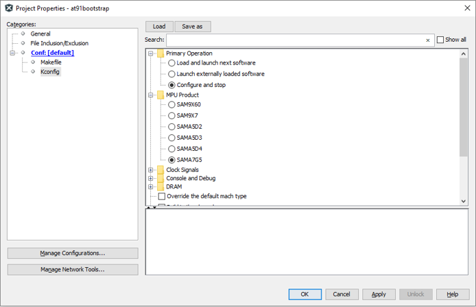 - Load {evaluation_kit}_bkpt_none_defconfig. For example, on SAMA7G5 Evaluation Kit, select sama7g5ek_bkptnone_defconfig as the configuration file