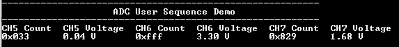 Analog input voltage in the range of 0 V to 3.3 V is fed to the ADC input channel AD6, AD7 and AD5. ADC conversion result is displayed on the console.
