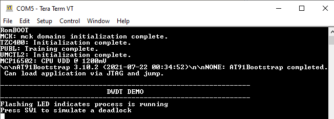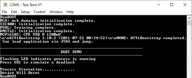 - LED2 stops blinking and “RomBOOT” is printed on the console indicating a processor reset