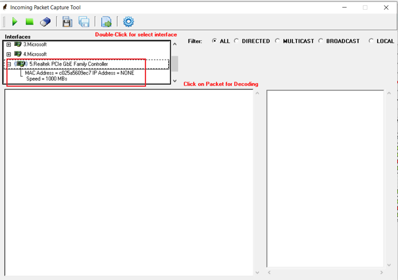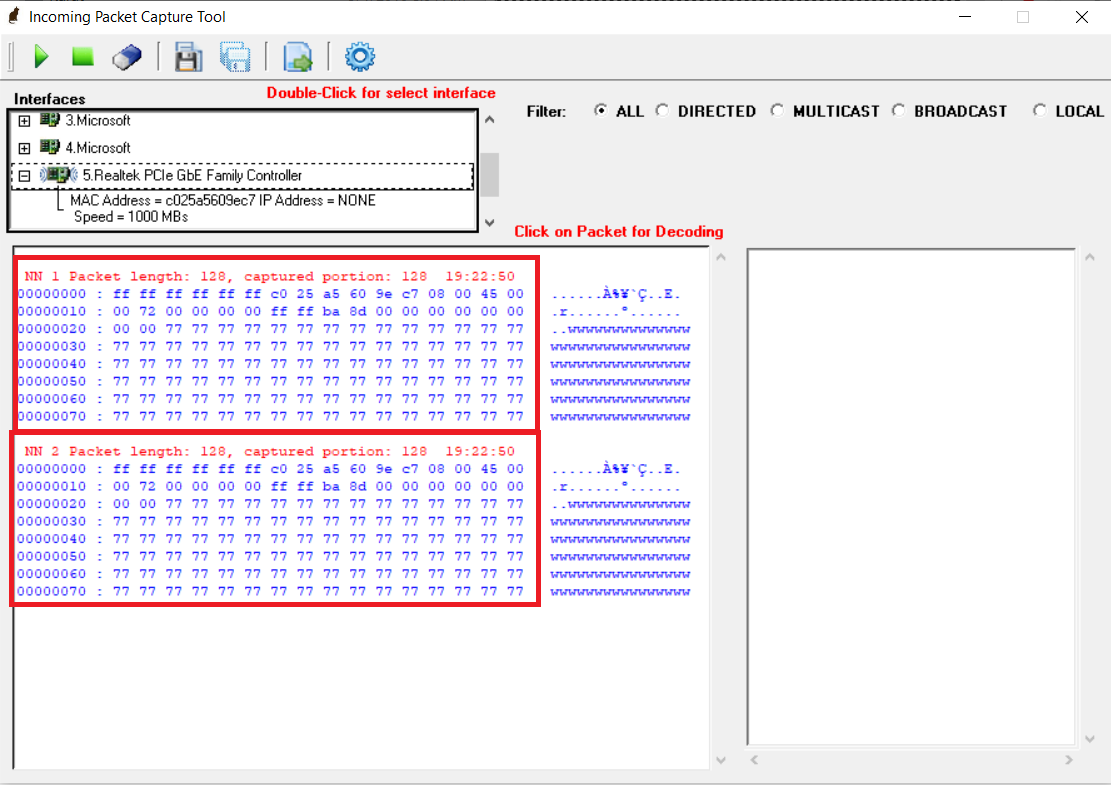 - Launch Packet Capture Tool to monitor the transmitted and received packets, see the following figure.