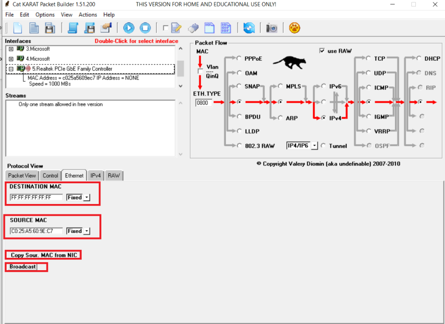 Figure 3-4. Packet Flow and View Settings - In the Ethernet tab, click Copy Source. MAC from NIC for source MAC and click Broadcast for Destination MAC, see the following figure.