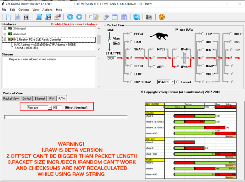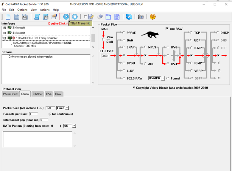 Figure 3-3. Interface Selection - In the Packet Flow pane, select use RAW check box and IPv4 check box. In the Control tab, set Packets per Burst to 1 and the Data Pattern to 77, Packet Size to 128, see the following figure.
