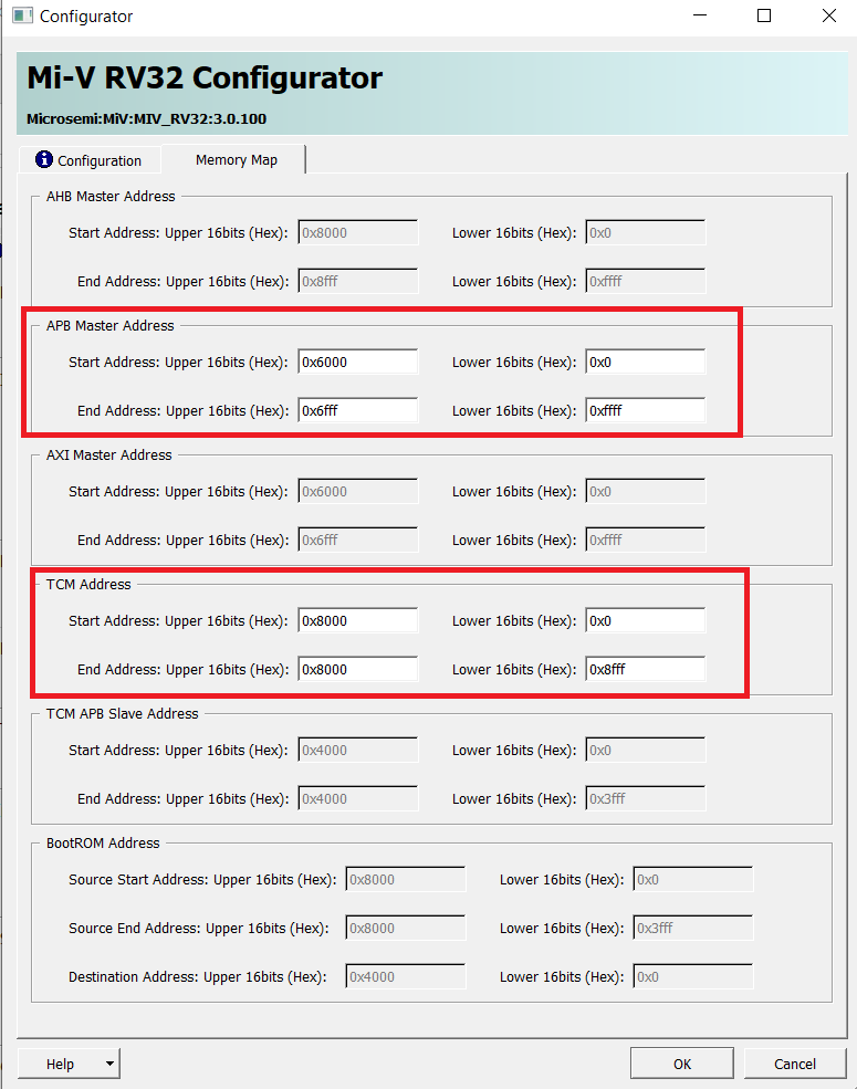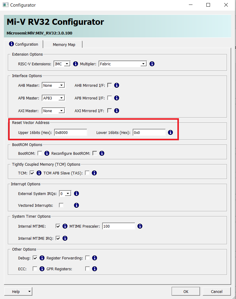 The following figures show the Mi-V soft processor configuration where the Reset Vector Address is set to 0x8000_0000. This is because in the Mi-V processor memory map, the memory range used for the APB interface is 0x6000_0000 to 0x6FFF_FFFF, and the memory range used for TCM is 0x8000_0000 to 0x8000_FFFF.