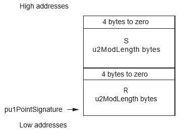 | pu1PointSignature | pu1 | I | Any RAM | 2*u2ScalarLength + 8 | Signature(r, s) | Corrupted |