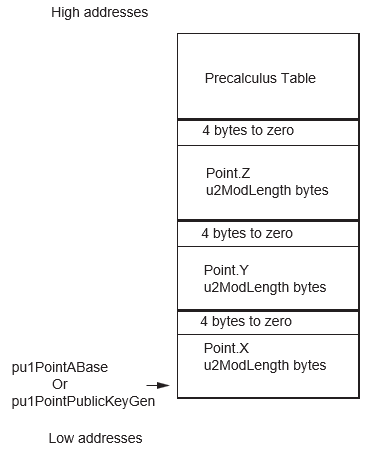 - {pu1ModCnsBase, u2ModLength + 4 + u2MaxLength + 12}, {pu1PointABase, (3 * u2ModLength + 12)* (2(WA-2))}, {pu1PointPublicKeyGen, (3 * u2ModLength + 12) * (2(WPub-2))}, {pu1OrderPointBase, u2ScalarLength + 4}, {nu1ABase, u2ModLength + 4}, {pu1AWorkBase, (u2ModLength + 4) + (8 * u2MaxLength + 44)} or {nu1HashBase, u2ScalarLength + 4} are not in Crypto RAM