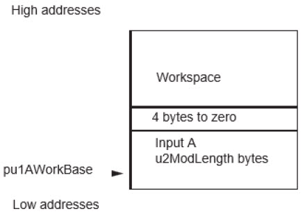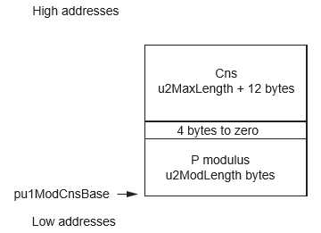 - P the modulus filled and Cns the working space for the Fast Modular Constant not initialized (pointed by {pu1ModBase, u2ModLength + u2MaxLength + 16})