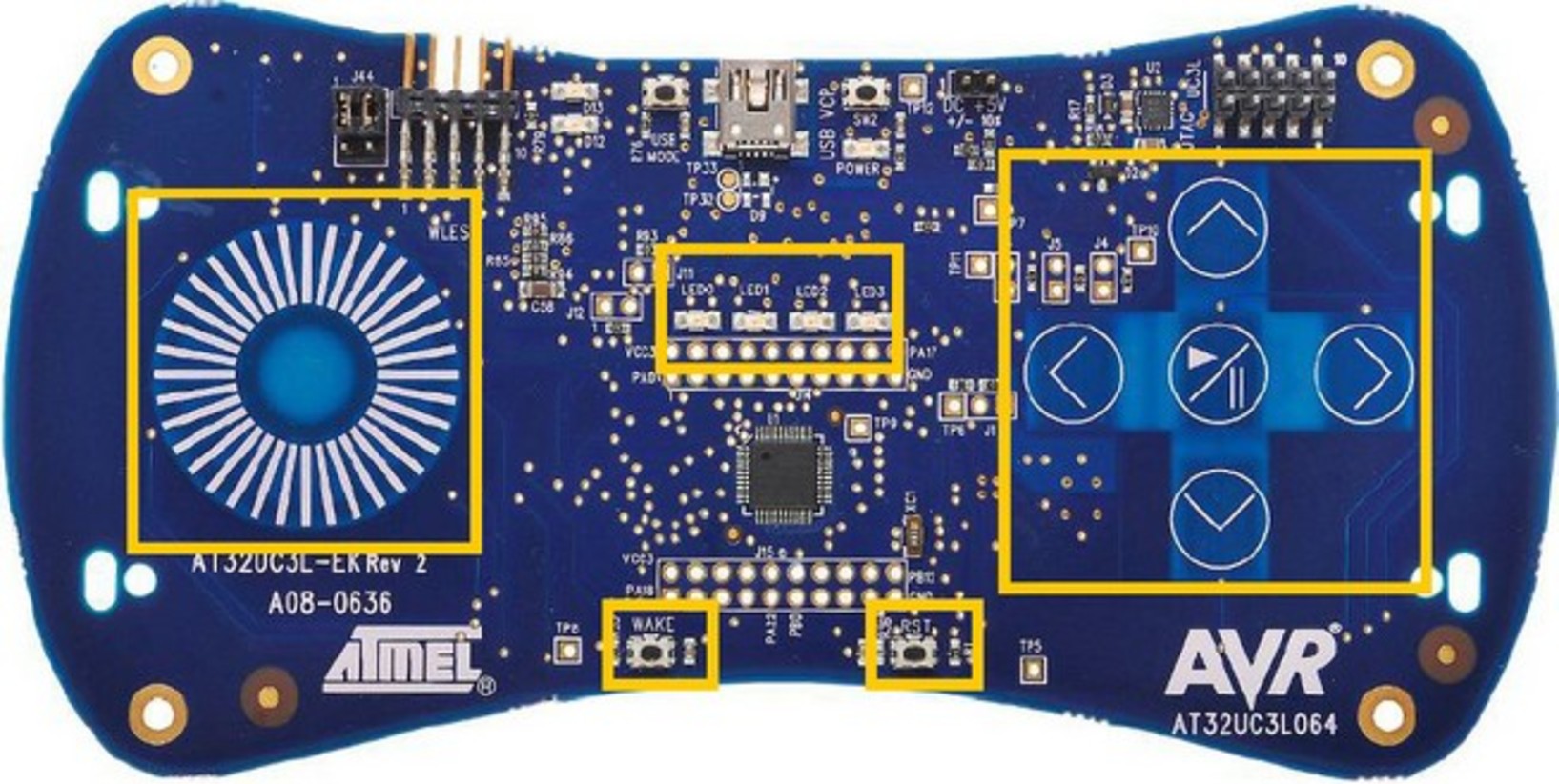 The main user interface offered by the kit is the touch user interface consisting of the wheel sensor and the five button sensors. The touch sensors are implemented by using the QMatrix method (X=6, Y=2). The CAT IP of the AT32UC3L064 is used, as is the ACIFB IP (implied by the use of the QMatrix method). Applications running on the AT32UC3L064 need to use the QTouch library for optimal touch events management.