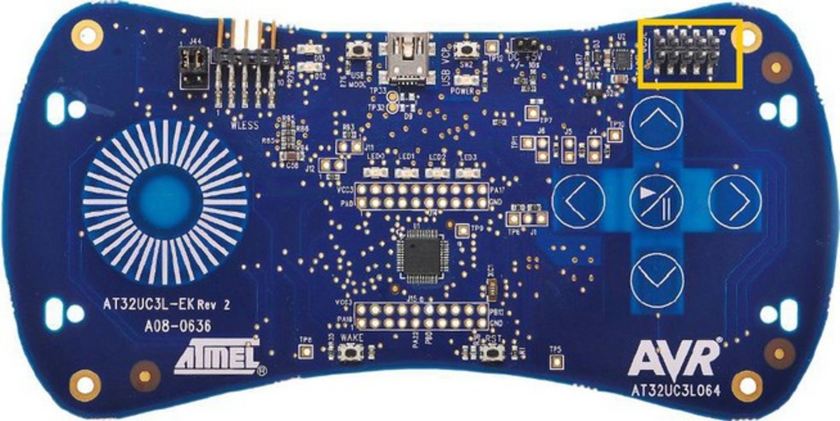 Note that there is another programming and debugging interface block on the kit, but it is related to the AT32UC3B1256 chip in charge of USB communication (refer to USB Interface).