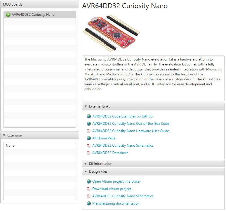 The page shown in Figure 5-1 will appear when AVR64DD32 Curiosity Nano is connected to MPLAB X.Figure 5-1. AVR64DD32 Curiosity Nano Page in MPLAB® X