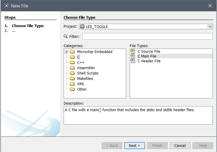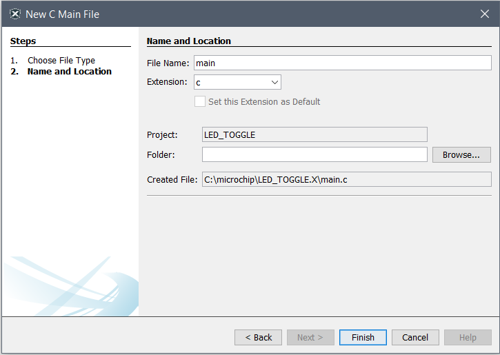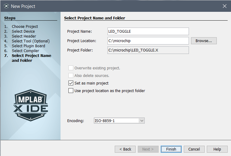 LED_TOGGLE) and the project location (e.g., C:\microchip), and click