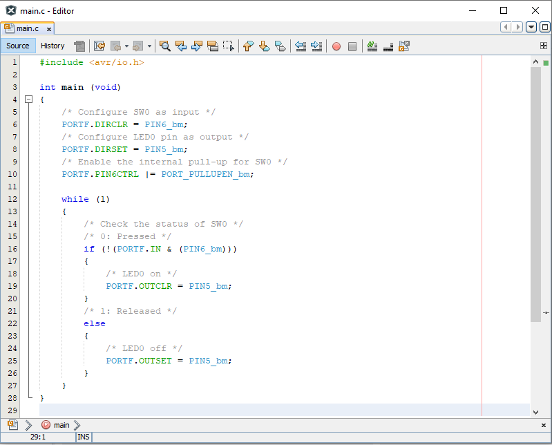 #inlude<avr/io.h> in main.c. In the code editor, the code will